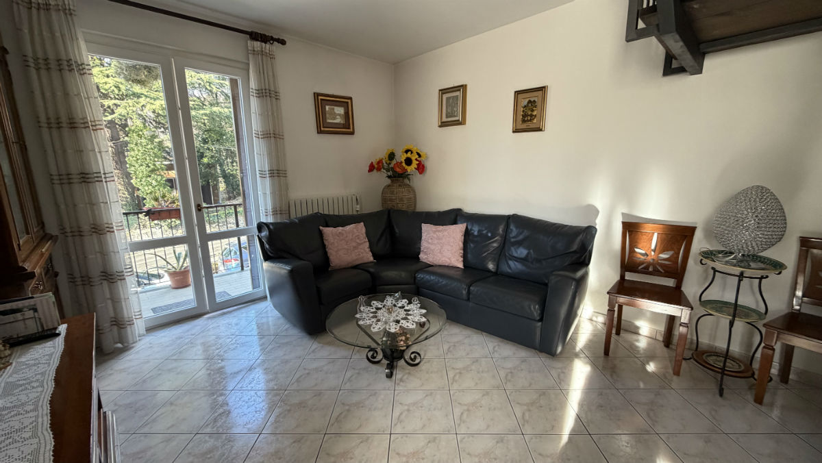 Piano primo: luminoso soggiorno con terrazzo, cucina abitabile con veranda, ampio terrazzone e accesso diretto al giardino terrazzato di circa 400 mq, bagno;